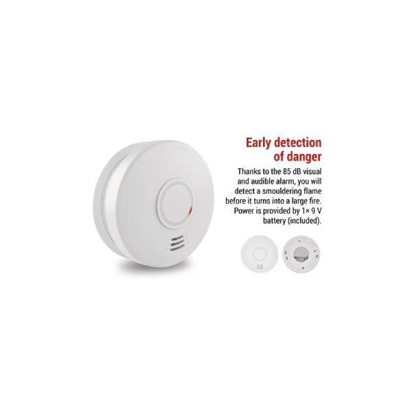 Ανιχνευτής καπνού EMOS P56503 /TSS910A/ σχεδιασμένος για τη μακροπρόθεσμη ασφάλεια του σπιτιού ή του γραφείου σας. Προστατεύει αξιόπιστα σε χώρους με υψηλότερο κίνδυνο πυρκαγιάς, όπως κουζίνες ή σαλόνια.Εξοπλισμένος με οπτική και ακουστική σηματοδότηση, ενεργοποιεί συναγερμό με ένταση ήχου >85 dB, ακουστός έως και 3 μέτρα. Συνδυάζει οπτική και ακουστική προειδοποίηση για έγκαιρη ειδοποίηση.Εύκολη εγκατάσταση και απλή λειτουργία με τροφοδοσία 1× 9 V που περιλαμβάνεται. Μπορεί να τοποθετηθεί στον τοίχο ή να είναι ανεξάρτητος, χωρίς πολύπλοκες συνδέσεις.